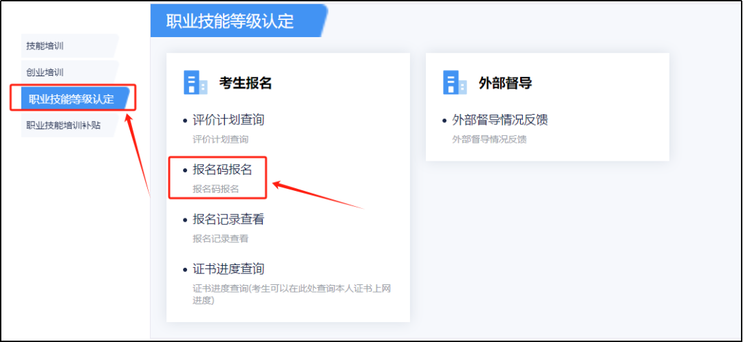 (3)登录后点击【事项办理】--左侧选择【职业技能等级认定】--考生报名一栏选择【报名码预报名】--根据考生报考级别选择输入本次考试报名码(本批次保育师五级考试报名码:95945f61;本批次保育师四级考试报名码:a01fc1f7),按照要求如实填写相关信息-【保存】-【提交】等待审核。