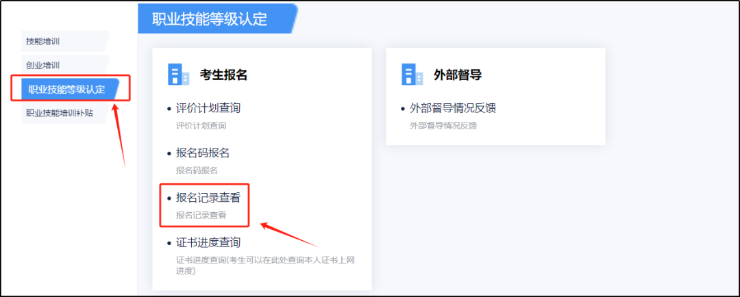 (4)报名记录查看点击-【事项办理】-【职业技能等级认定】-【报名记录查看】。