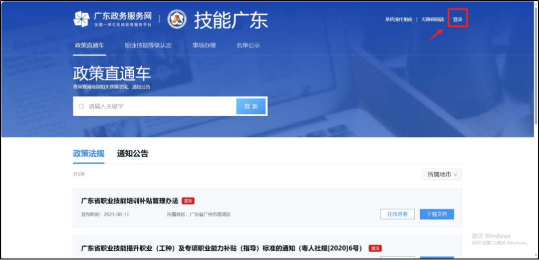 (1)登录网址:https://ggfw.hrss.gd.gov.cn/OUPX/,点击【登录】。